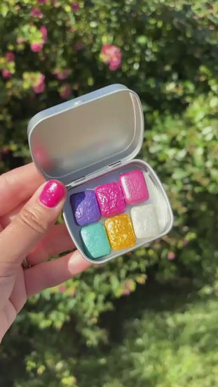 Caja metálica con 6 pastillas de acuarelas Brilli en tamaño quarter pan (1 ml). Tonos seleccionados por mí en base a mis colores favoritos de la marca "Pigmento y moleta", en una cajita personalizada, que toda Girl debería tener!