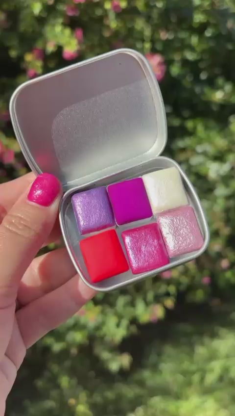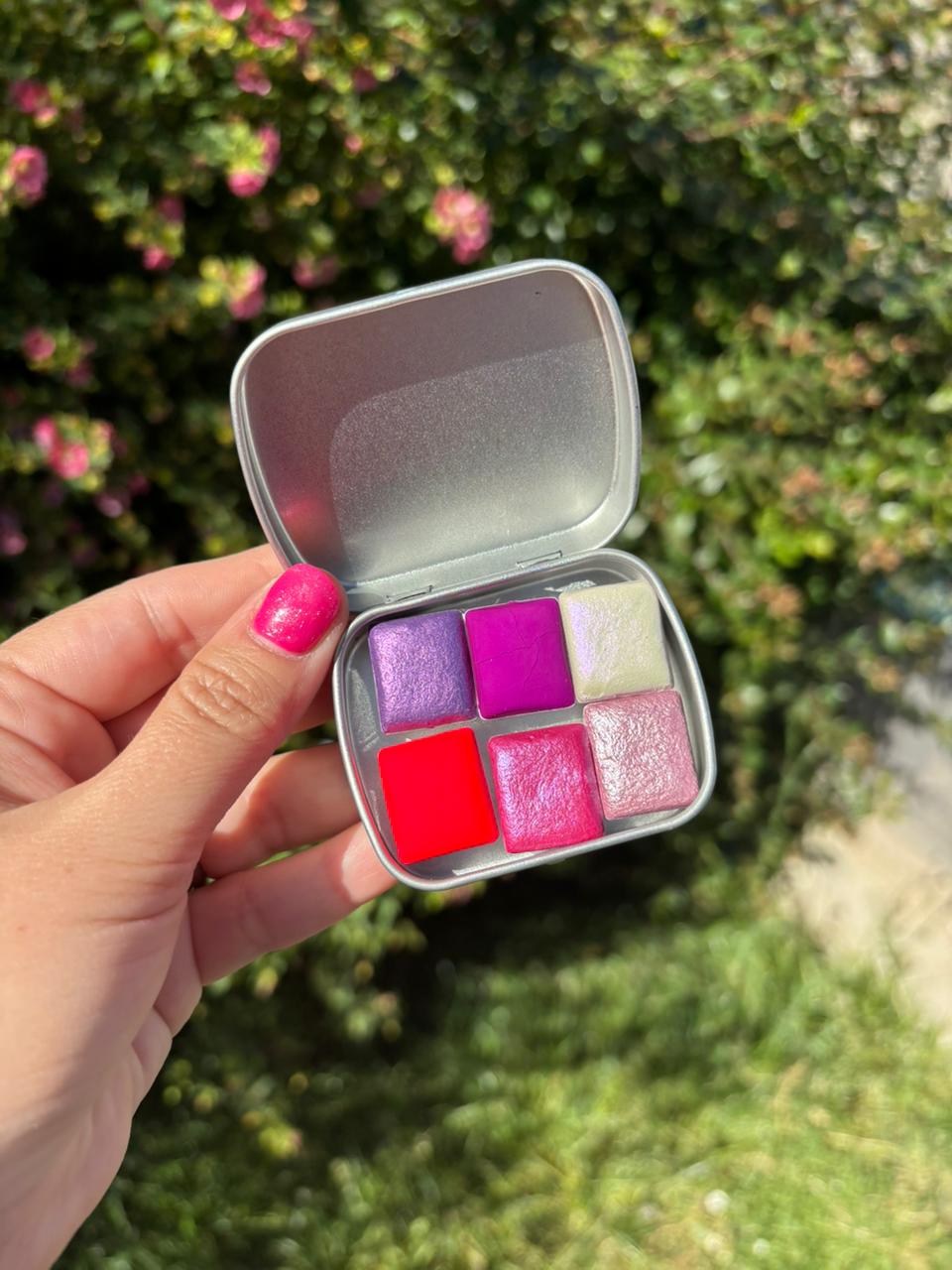 Caja metálica con 6 pastillas de acuarelas en tonos metalizados y flúor en tamaño half pan (2 ml) de la marca "Pigmento y moleta". Tonos seleccionados por mí en una cajita personalizada, que toda Woman debería tener!